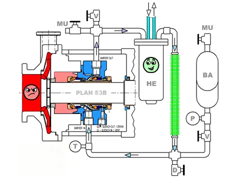 - Monitor the barrier-fluid loop regularly: filter condition, fluid cleanliness, differential pressure, and heat-exchanger (if fitted) performance. Any drop in expected flow/pressure could indicate obstruction or contamination of the pumping ring.