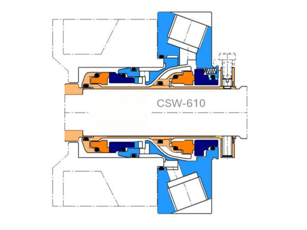 The CSW-610 Compact Double Mechanical Seal is a compact double-cartridge mechanical seal designed with an integral bi-directional barrier-fluid pumping ring. It is purpose-built for equipment with short outboard lengths and narrow cross-section seal chambers — common in compact process pumps used in pulp & paper, water & wastewater, and other process industries.